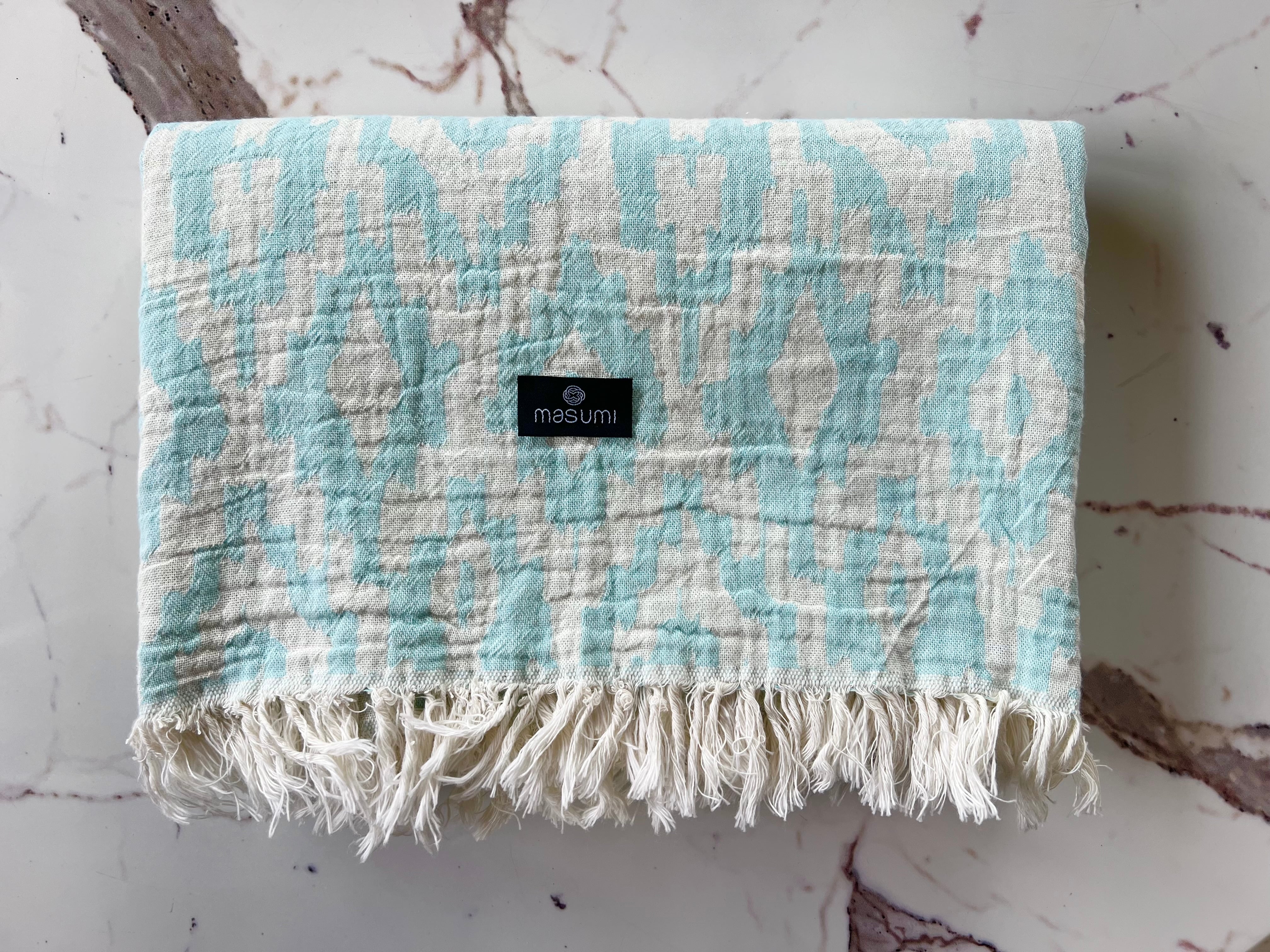 バスタオルより軽くて、何枚でもビーチバックに、良く吸いとるのに早く乾く。日常のタオルとして、ビーチウェア、ファッションストール、ホームブランケット、テーブルクロス、ピクニックや赤ちゃんのおくるみとして、また、プレゼントにもぴったりな大きさで、アウトドアでの活躍も期待できます。