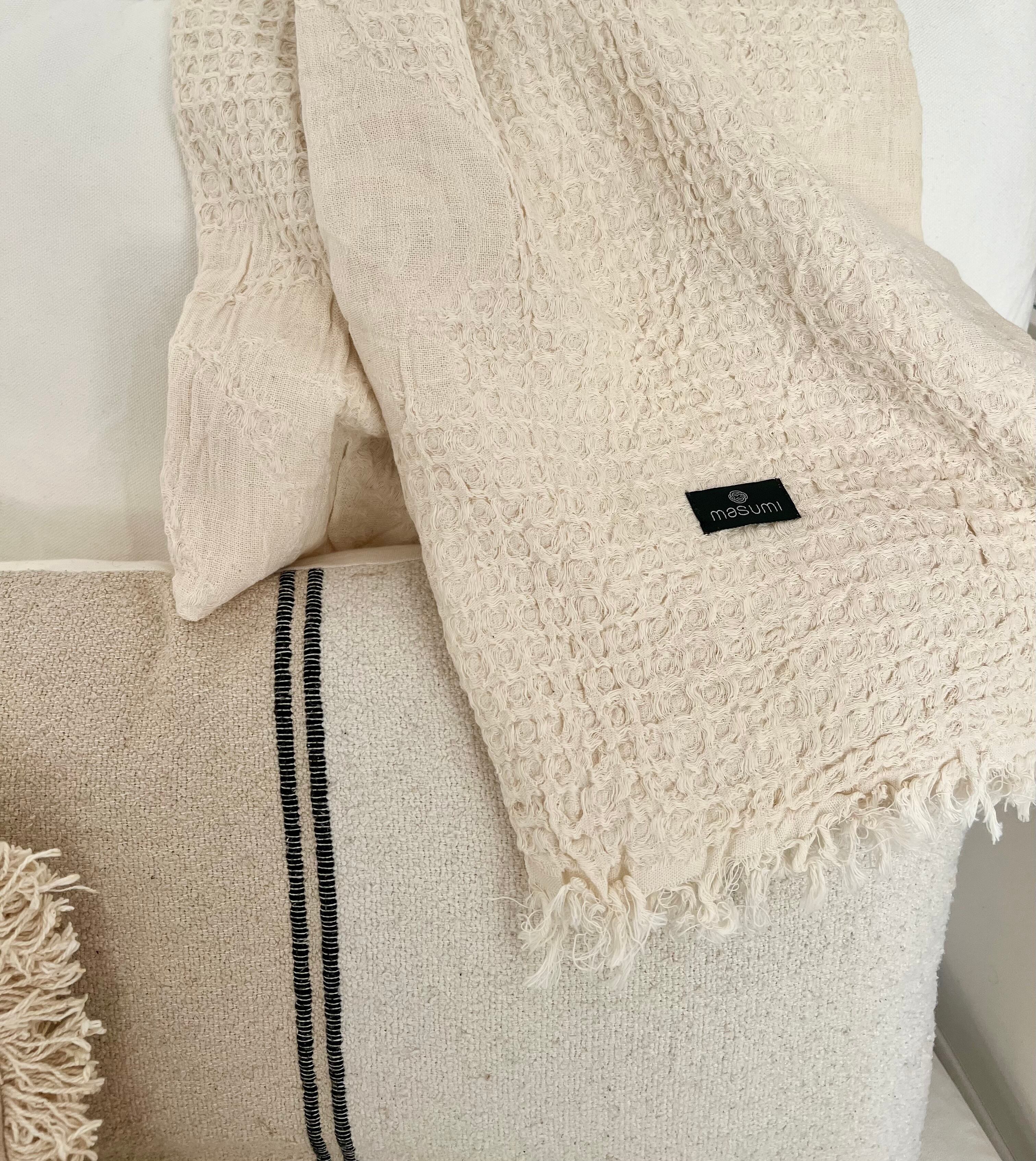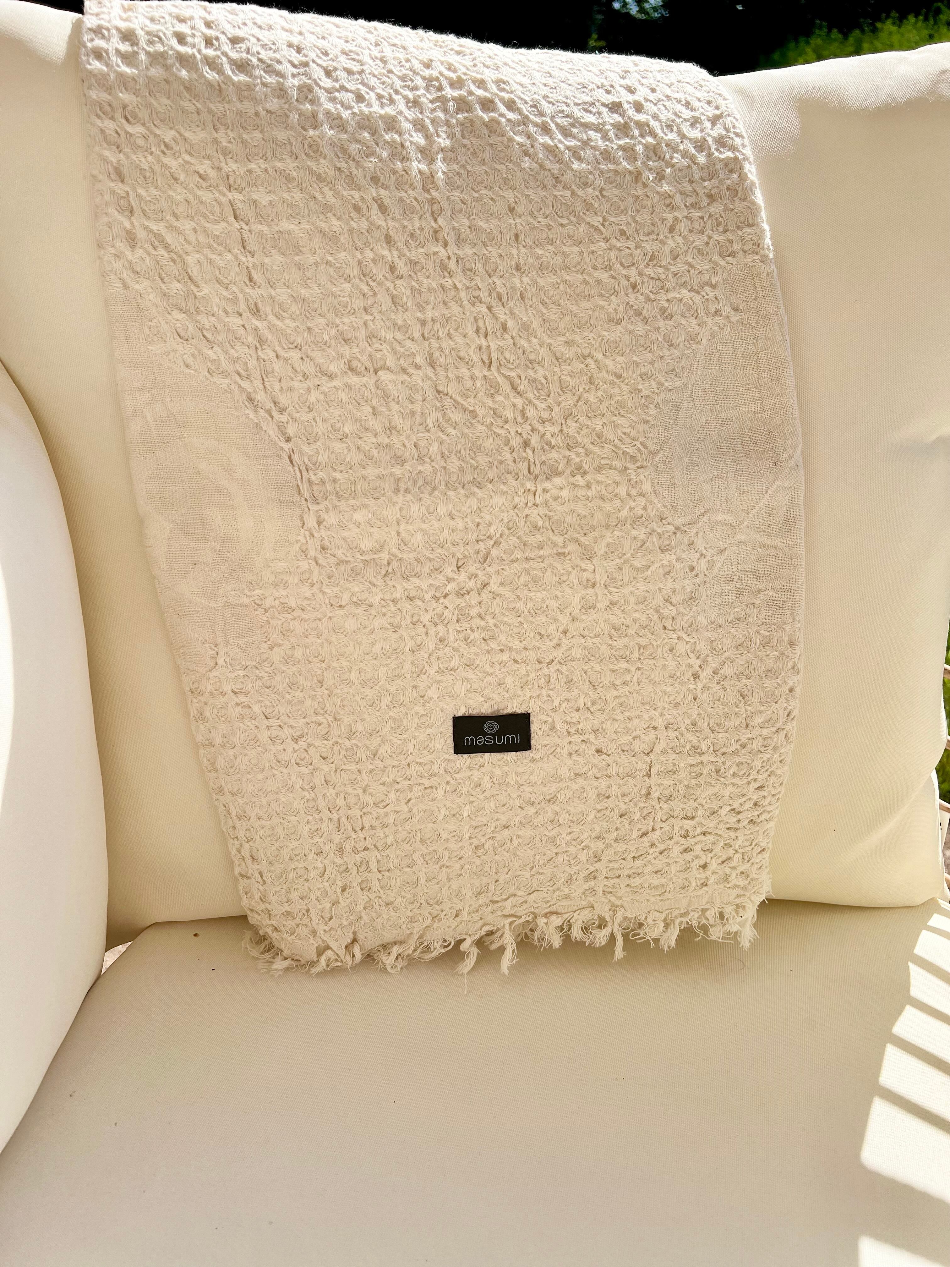 バスタオルより軽くて、何枚でもビーチバックに、良く吸いとるのに早く乾く。日常のタオルとして、ビーチウェア、ファッションストール、ホームブランケット、テーブルクロス、ピクニックや赤ちゃんのおくるみとして、様々なシーンで使える素晴らしい素材をぜひ日常に。